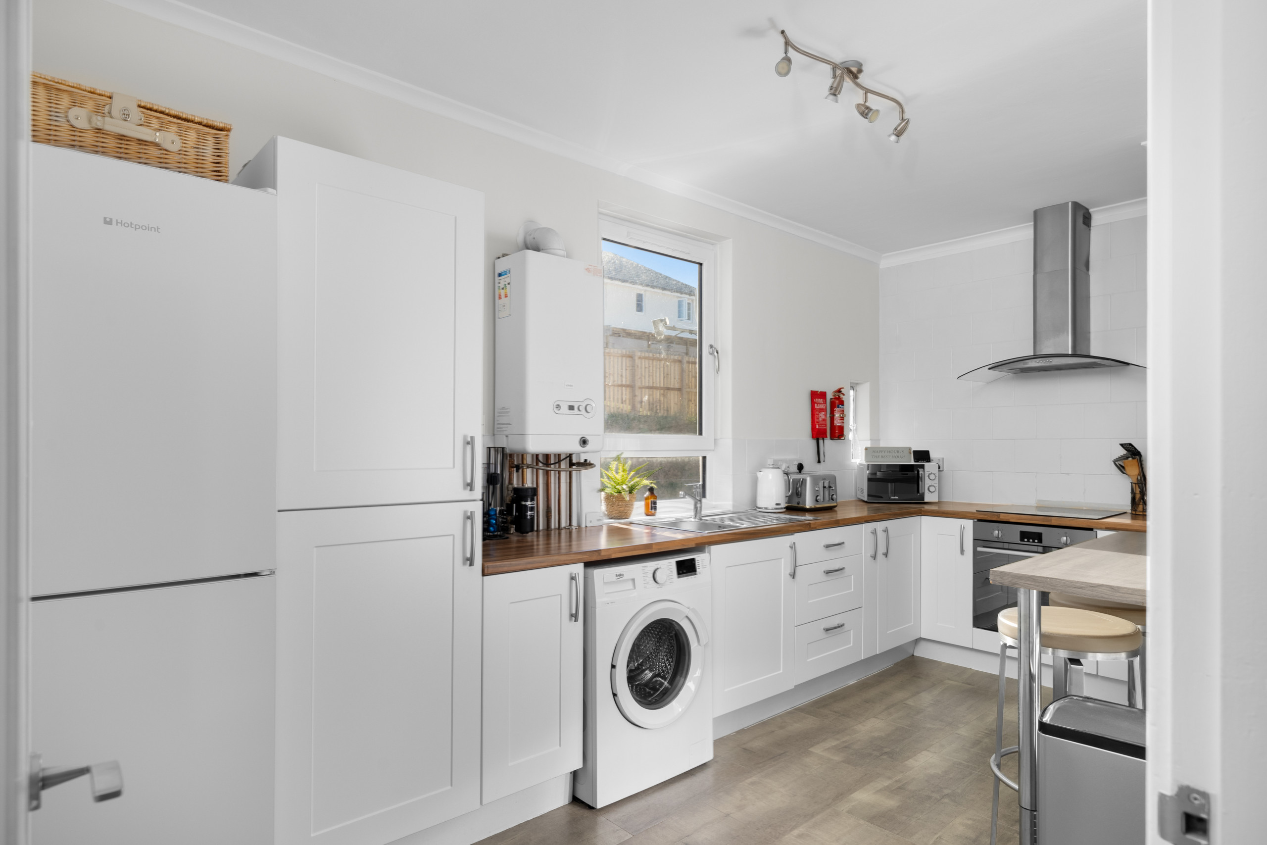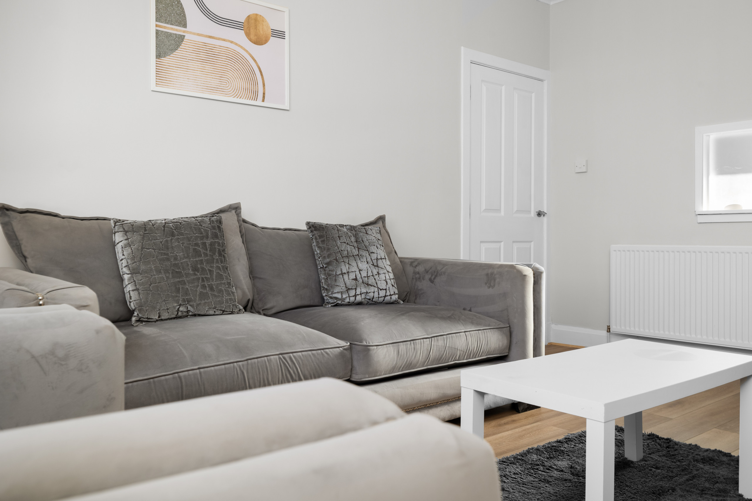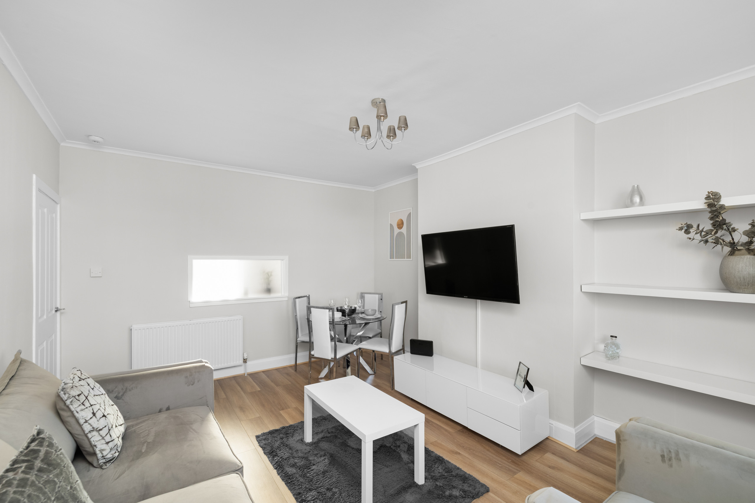 The living areas are light, airy, and tastefully decorated with soft greys, muted whites, subtle floral wallpaper, and contemporary lighting. The lounge is perfect for relaxing, reading, or watching Netflix and Freeview TV with the family or group. A dining table and breakfast bar provide plenty of space for meals, whether you’re cooking at home or enjoying takeaway from one of Dundee’s many restaurants.