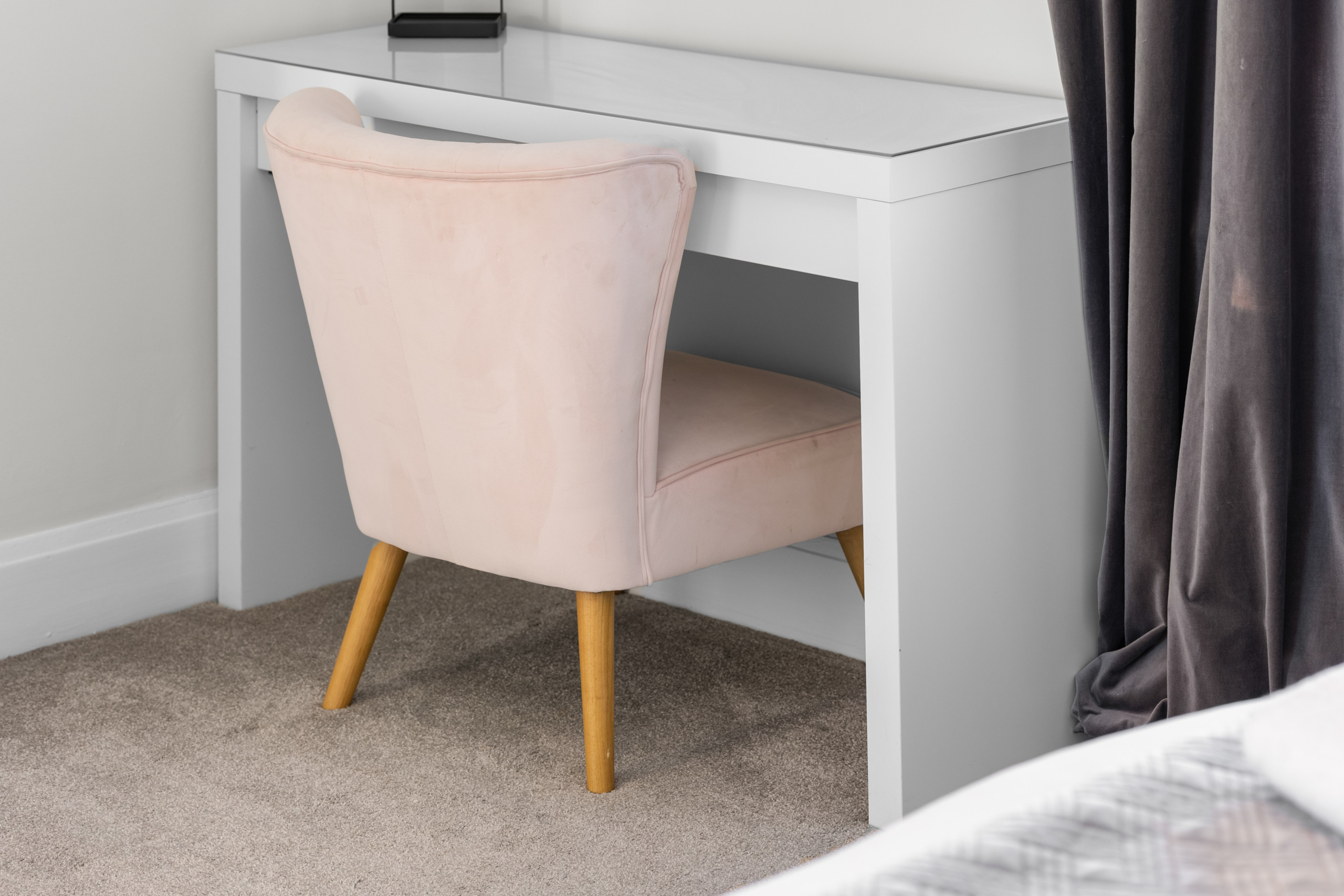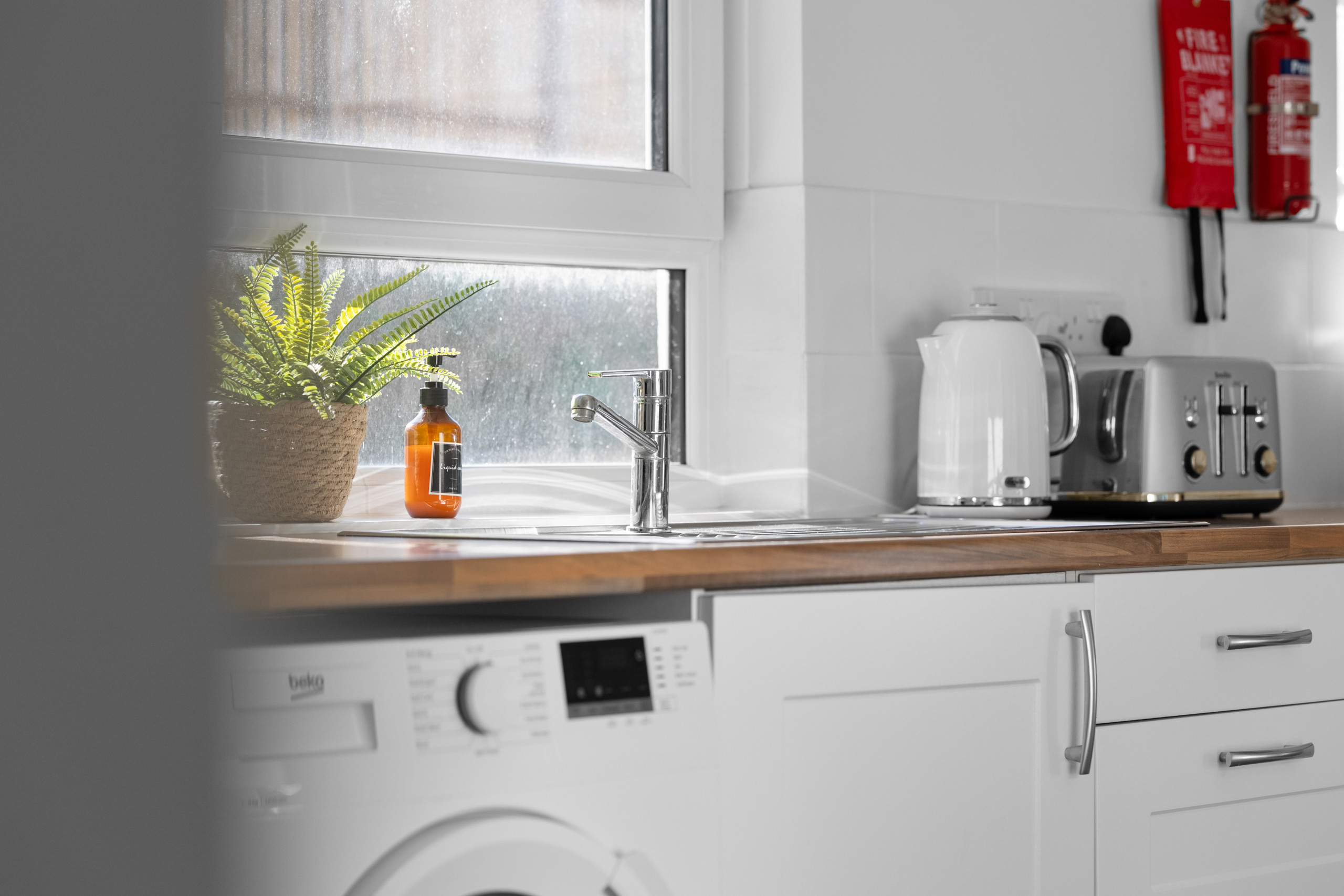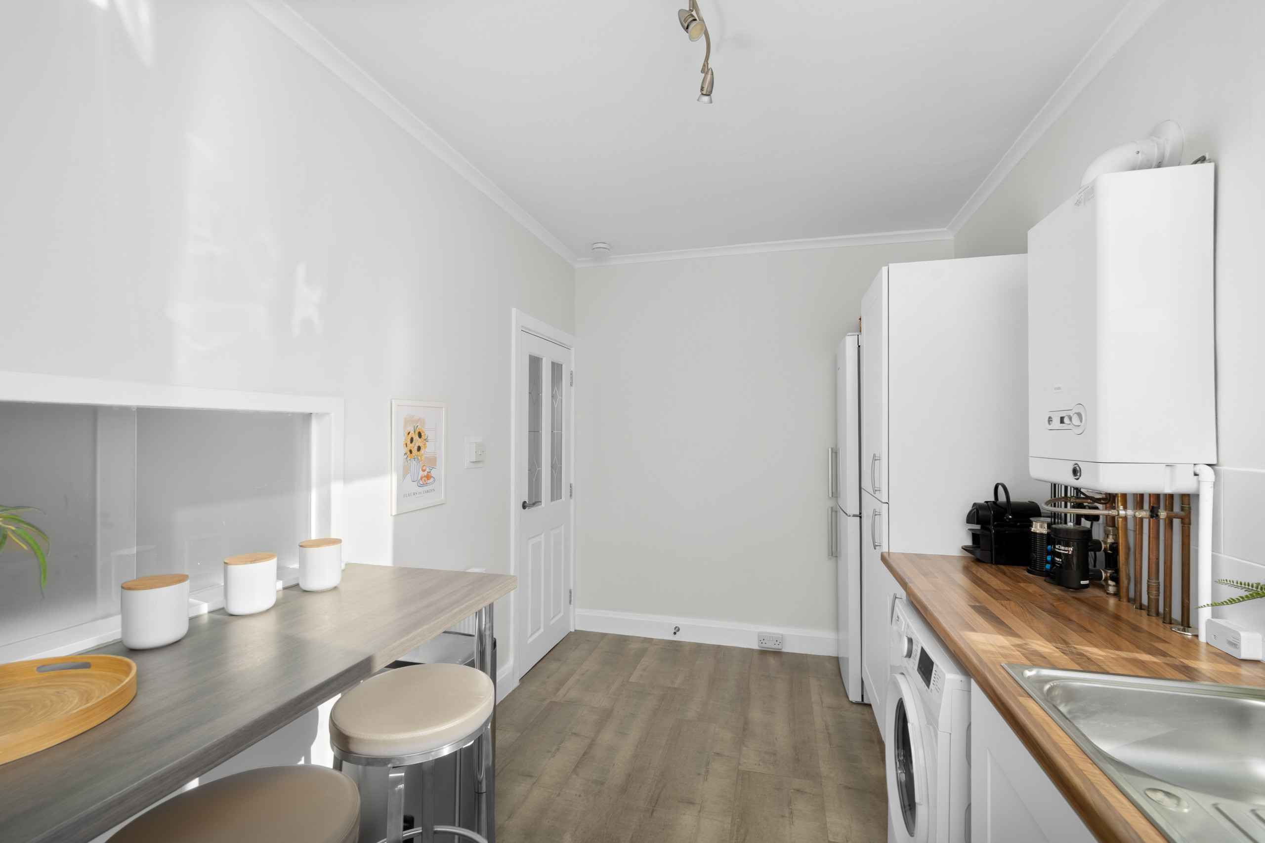 The living areas are light, airy, and tastefully decorated with soft greys, muted whites, subtle floral wallpaper, and contemporary lighting. The lounge is perfect for relaxing, reading, or watching Netflix and Freeview TV with the family or group. A dining table and breakfast bar provide plenty of space for meals, whether you’re cooking at home or enjoying takeaway from one of Dundee’s many restaurants.